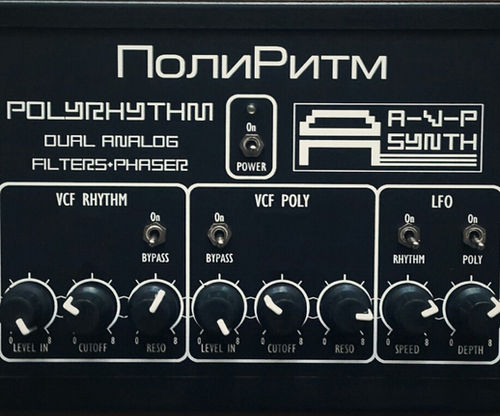 PolyRhythm is a dual analog filter + phaser box. It has two voltage controlled filters and a low-frequency oscillator made from authentic Soviet components. It has 8 knobs, 5 switches with which you can control the parameters of the sound. Both filters are made of components and circuitry in accordance with well-known Soviet synthesizers, produced in USSR back in the 80's and 90's.